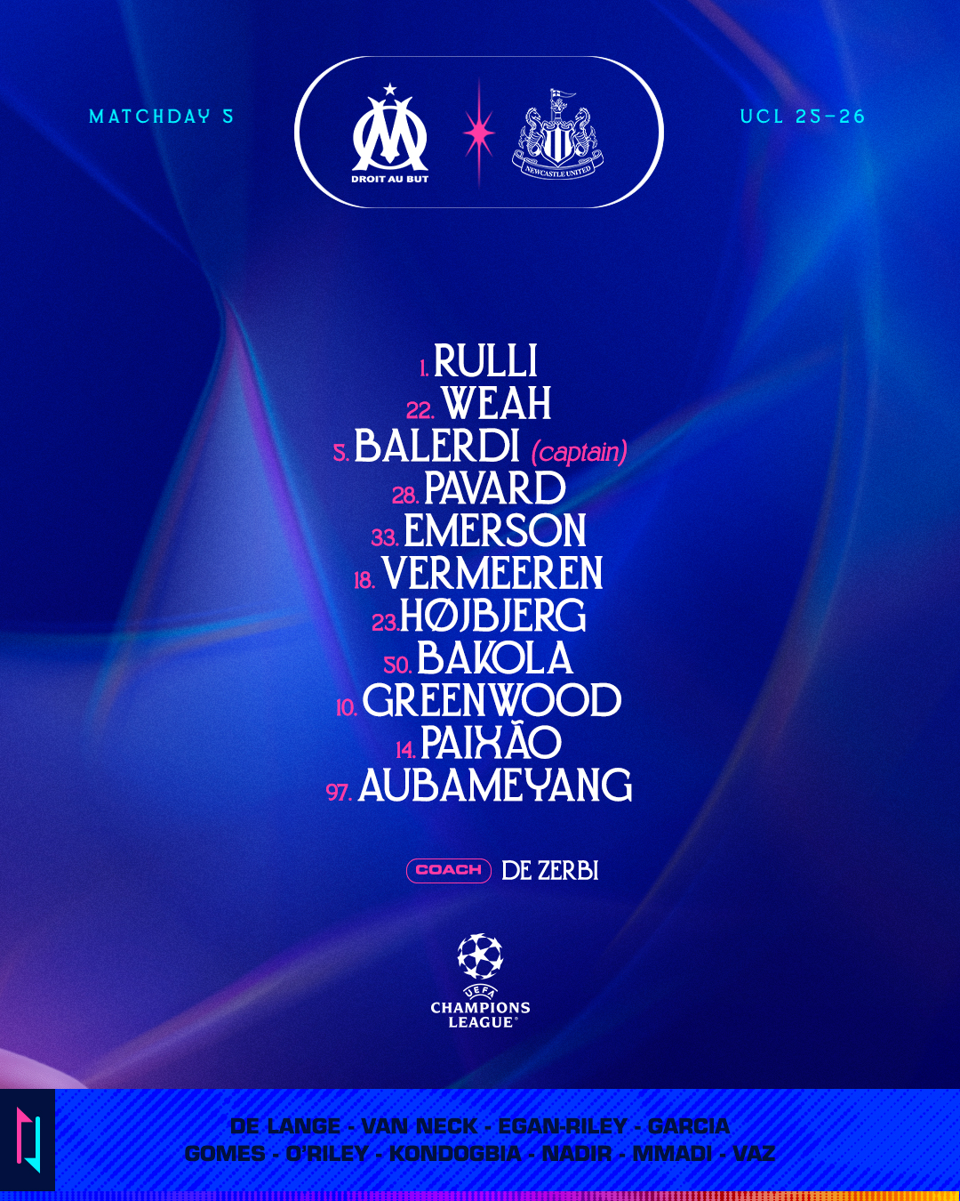 北京時間11月26日凌晨4:00,25/26賽季歐冠聯(lián)賽第5輪,馬賽主場對陣紐卡斯?fàn)柭?lián),賽前首發(fā)公布。