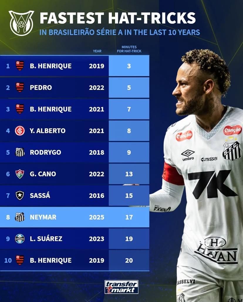 近10年巴甲最快帽子戲法:內(nèi)馬爾17分鐘戴帽第8,羅德里戈上榜