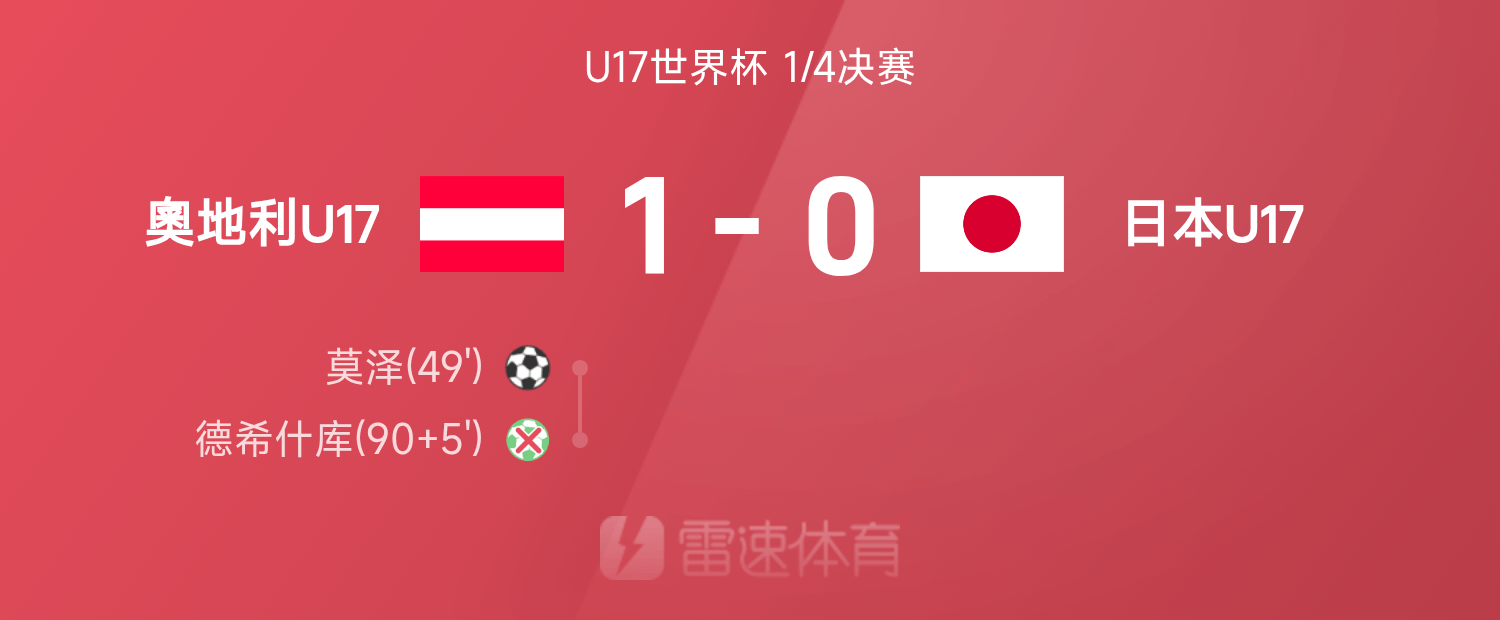 雷速體育11月21日訊 25賽季U17世界杯1/4決賽,奧地利U17隊(duì)1-0戰(zhàn)勝日本U17隊(duì)。全場比賽,莫澤破門建功,德希什庫失點(diǎn)。
