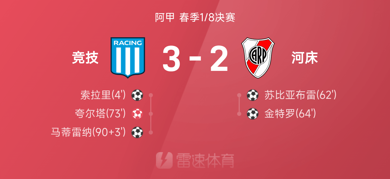 雷速體育11月25日訊 25賽季阿甲春季1/8決賽,競技3-2戰(zhàn)勝河床,馬蒂雷納第90+3分鐘上演絕殺。全場比賽,馬蒂雷納、索拉里破門建功,金特羅、蘇比亞布雷破門難救主,夸爾塔自擺烏龍。