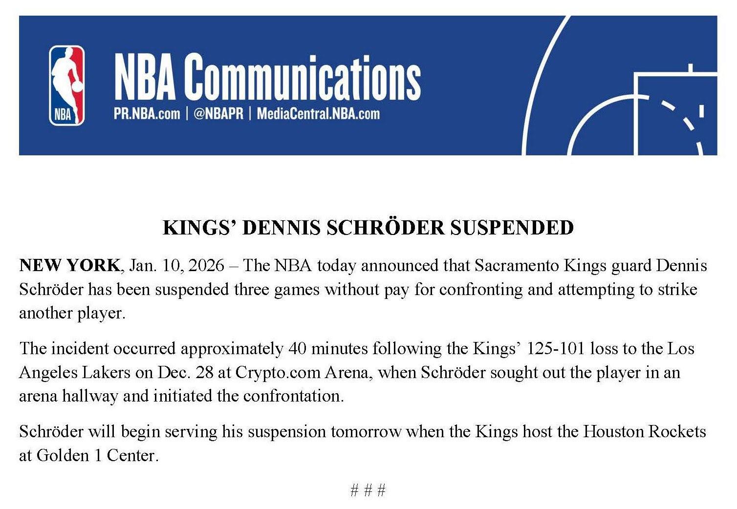 北京時間1月11日,NBA官方發(fā)布公告,國王球員施羅德被禁賽3場。