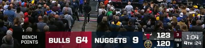 據(jù)統(tǒng)計,在第四節(jié)還剩1分04秒時,公牛隊(duì)與掘金隊(duì)的替補(bǔ)得分比為懸殊的64-9,在最后時刻,公牛替補(bǔ)后衛(wèi)多森姆通過罰球奠定勝局,讓這個對比定格為66-9。