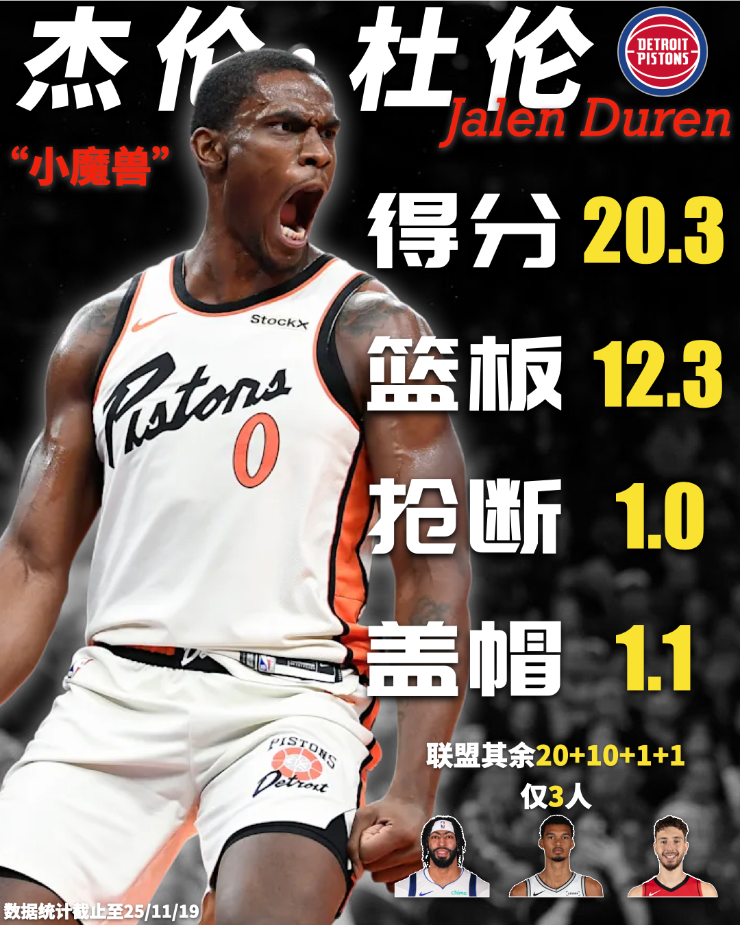 不過,對于一名剛滿22歲的年輕內(nèi)線而言,杜倫已經(jīng)相當(dāng)不錯(cuò)了。雖然我們給他的防守挑刺,但僅靠運(yùn)動(dòng)能力和原始本能,杜倫已經(jīng)躋身搶斷蓋帽1+1的行列。再加上他場均20+10的輸出,這樣攻守兼?zhèn)涞那騿T也就4個(gè),文班亞馬、戴維斯、申京。還有杜倫。