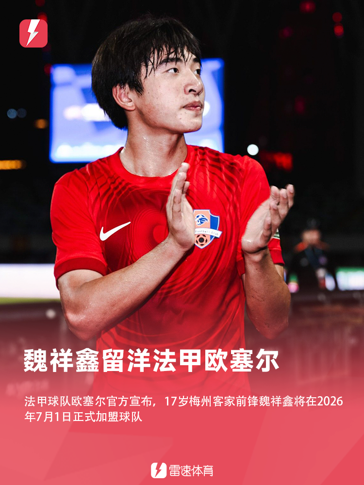 雷速體育11月23日訊 今天上午,法甲球隊歐塞爾官方宣布,17歲梅州客家前鋒魏祥鑫將在2026年7月1日正式加盟球隊。