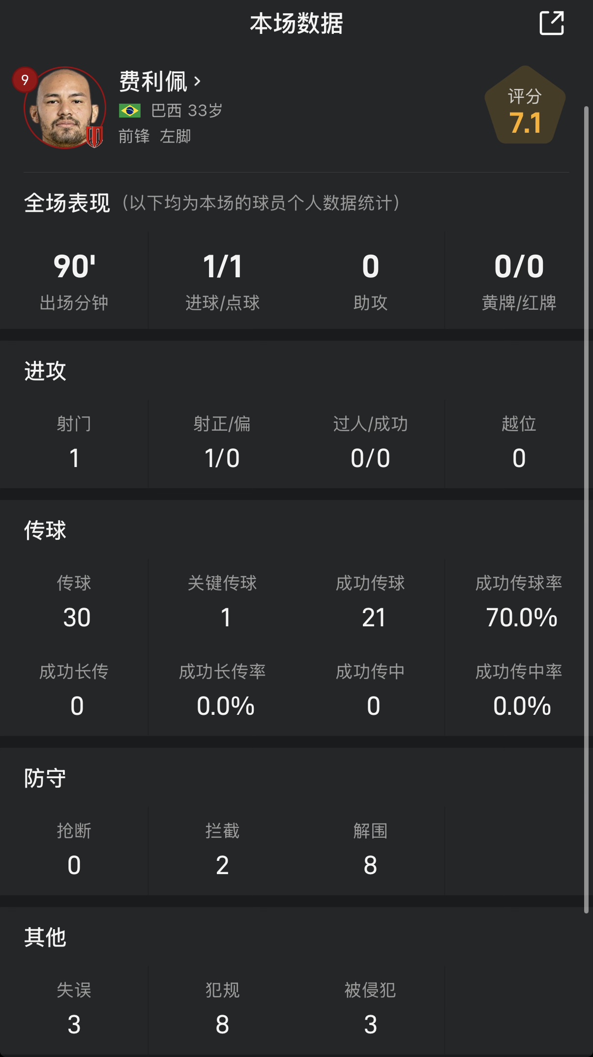 費利佩全場數(shù)據(jù):防守端貢獻8解圍,點射為球隊首開記錄