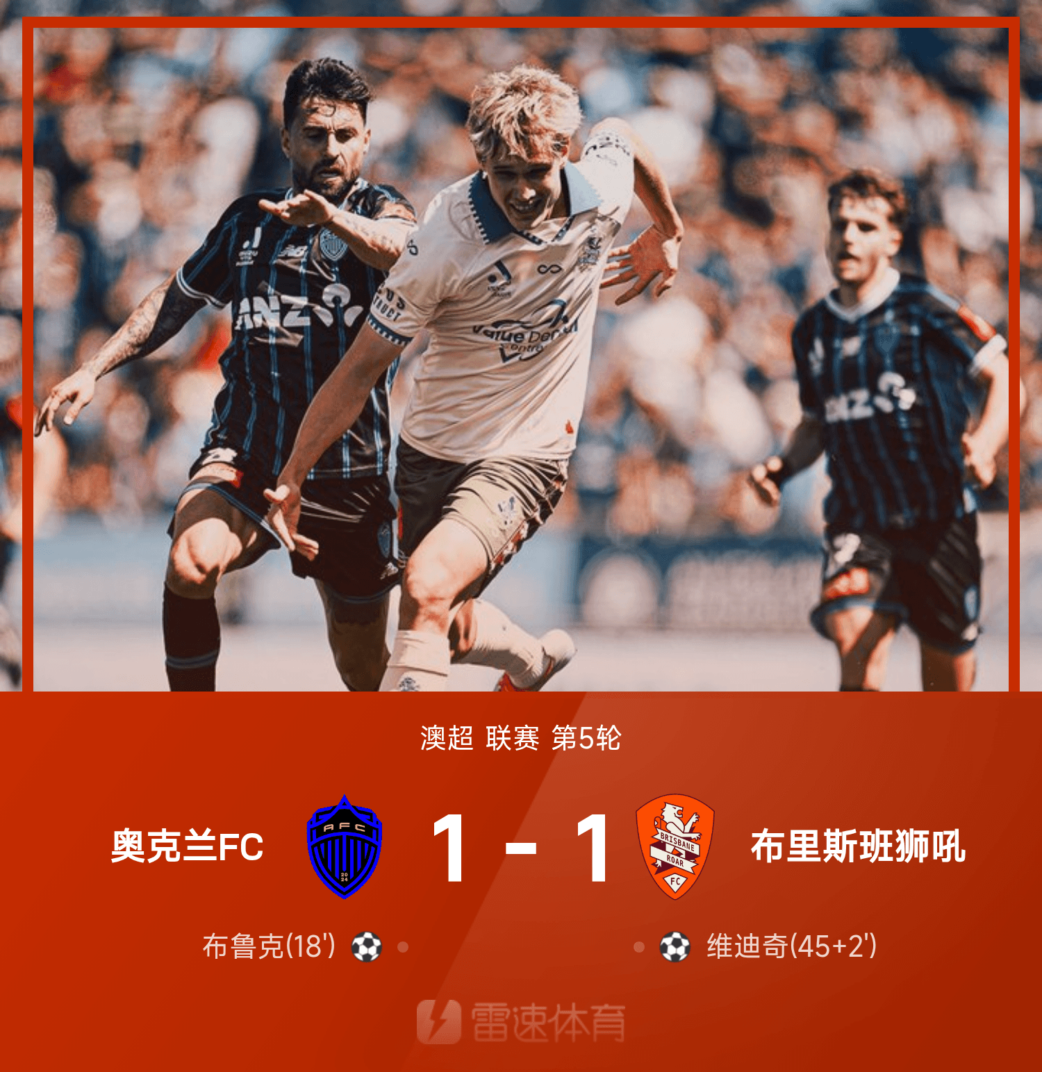 雷速體育11月23日訊 25/26賽季澳超聯(lián)賽第5輪,奧克蘭FC1-1戰(zhàn)平布里斯班獅吼。