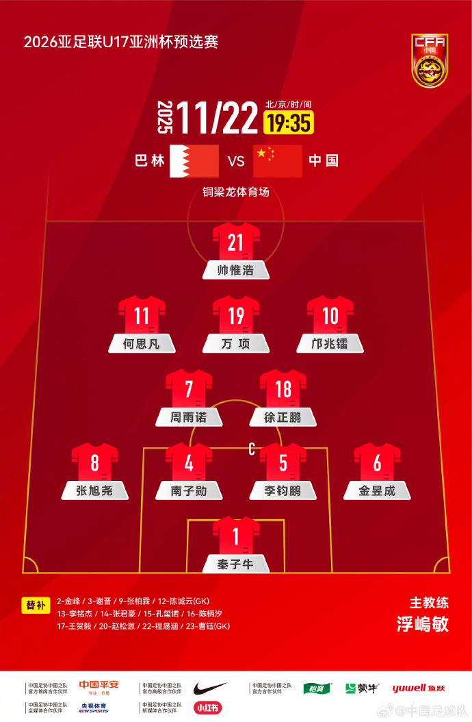雷速體育11月23日訊 U17亞洲杯預(yù)選賽首輪,中國U16對陣巴林U16。