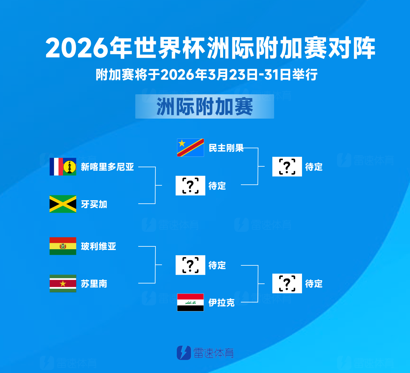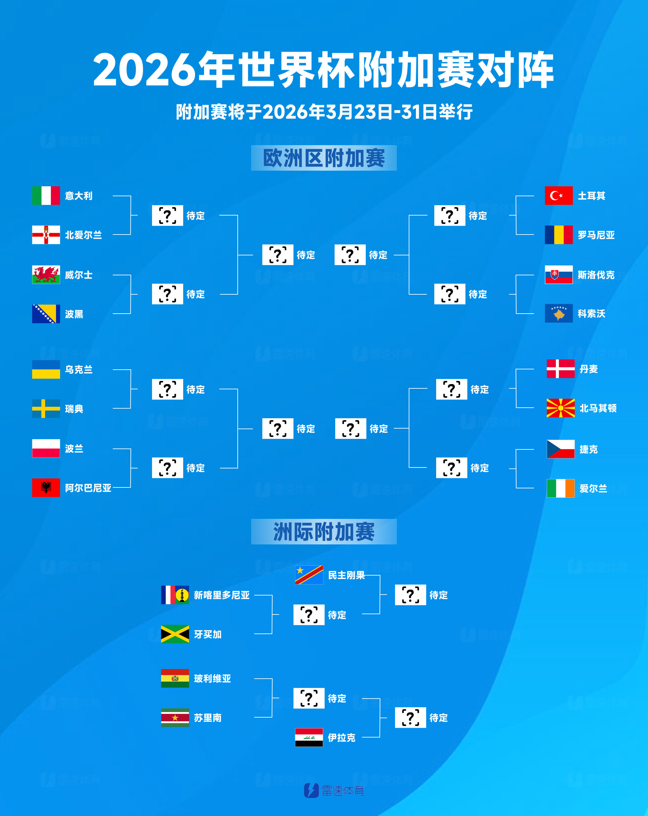 雷速體育11月20日訊 北京時間今晚8點,2026世界杯洲際附加賽和歐洲區(qū)附加賽抽簽儀式將在瑞士蘇黎世舉行。