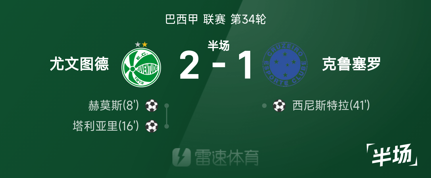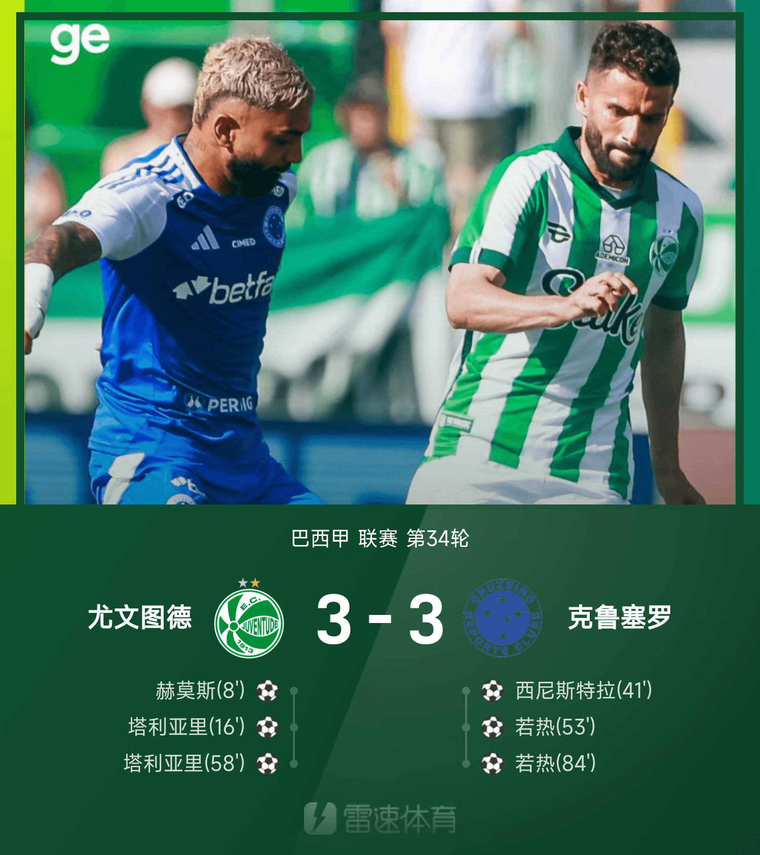 雷速體育11月20日訊 巴甲第34輪,尤文圖德主場迎戰(zhàn)克魯塞羅。
