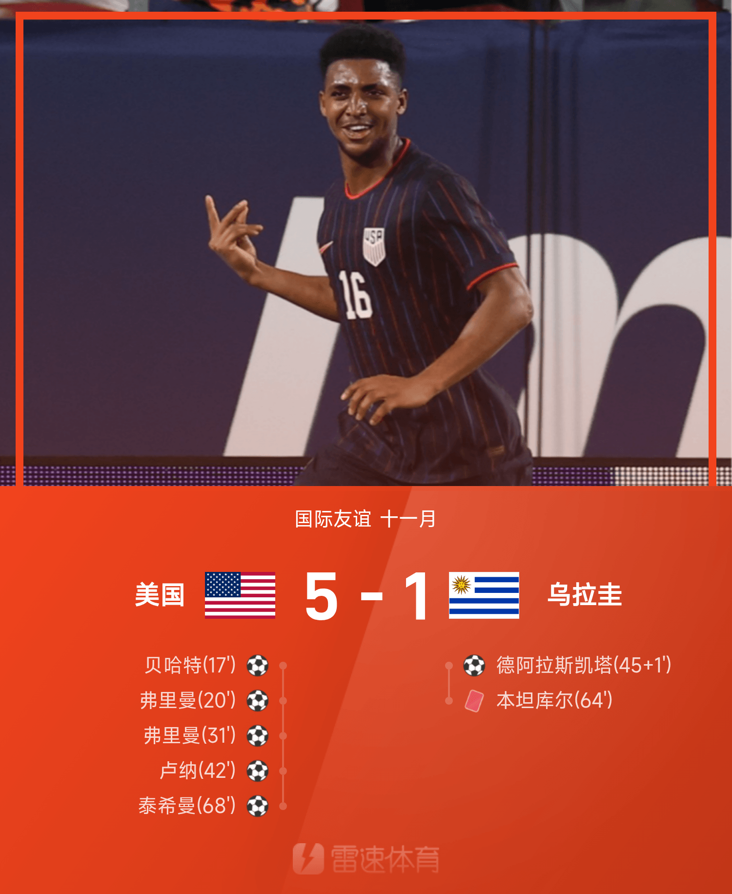 友誼賽戰(zhàn)報(bào):弗里曼雙響本坦庫(kù)爾染紅,美國(guó)5-1十人烏拉圭