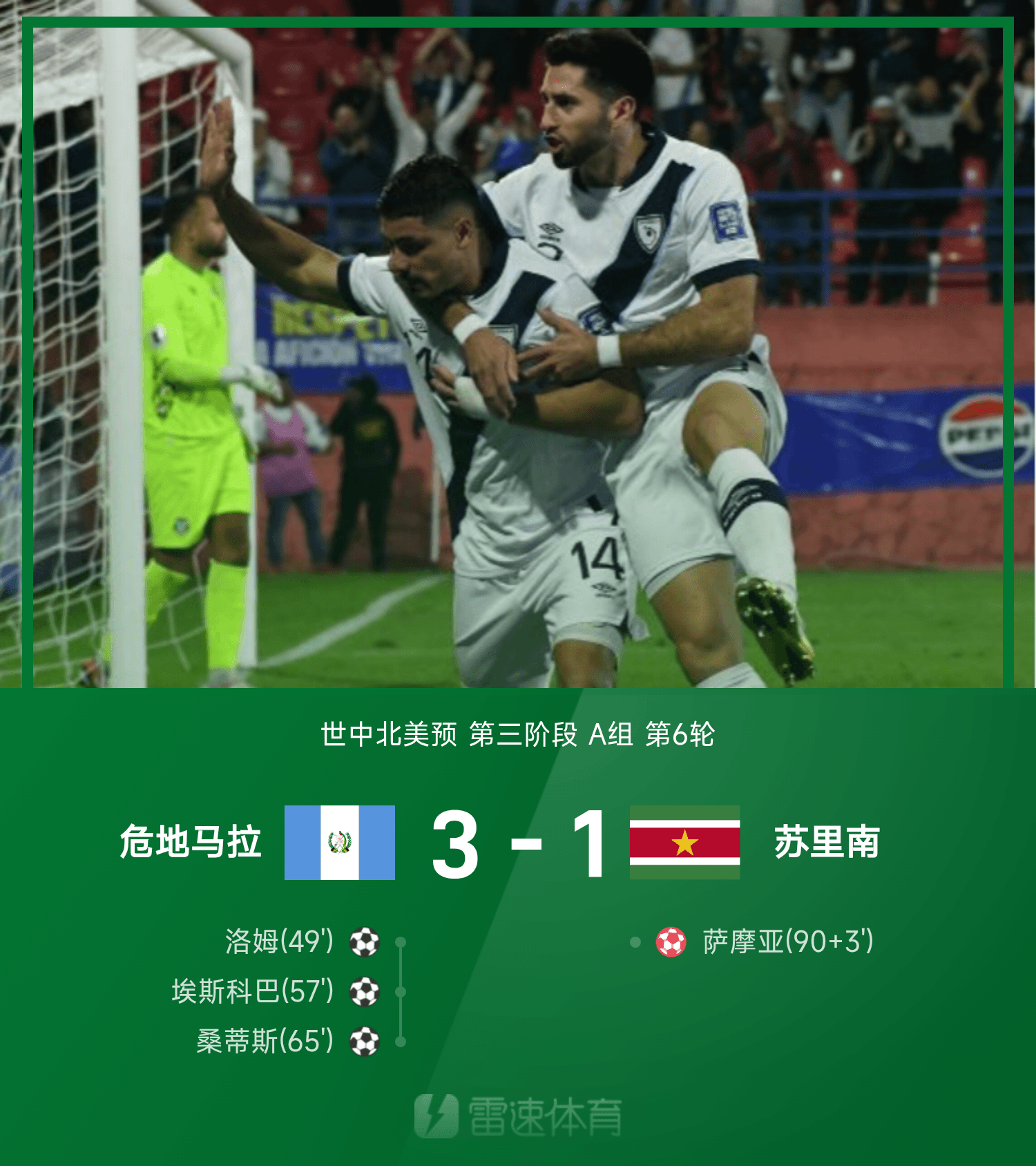 雷速體育11月19日訊 26賽季世中北美預(yù)第三階段A組第6輪,危地馬拉主場(chǎng)以3-1輕取蘇里南。