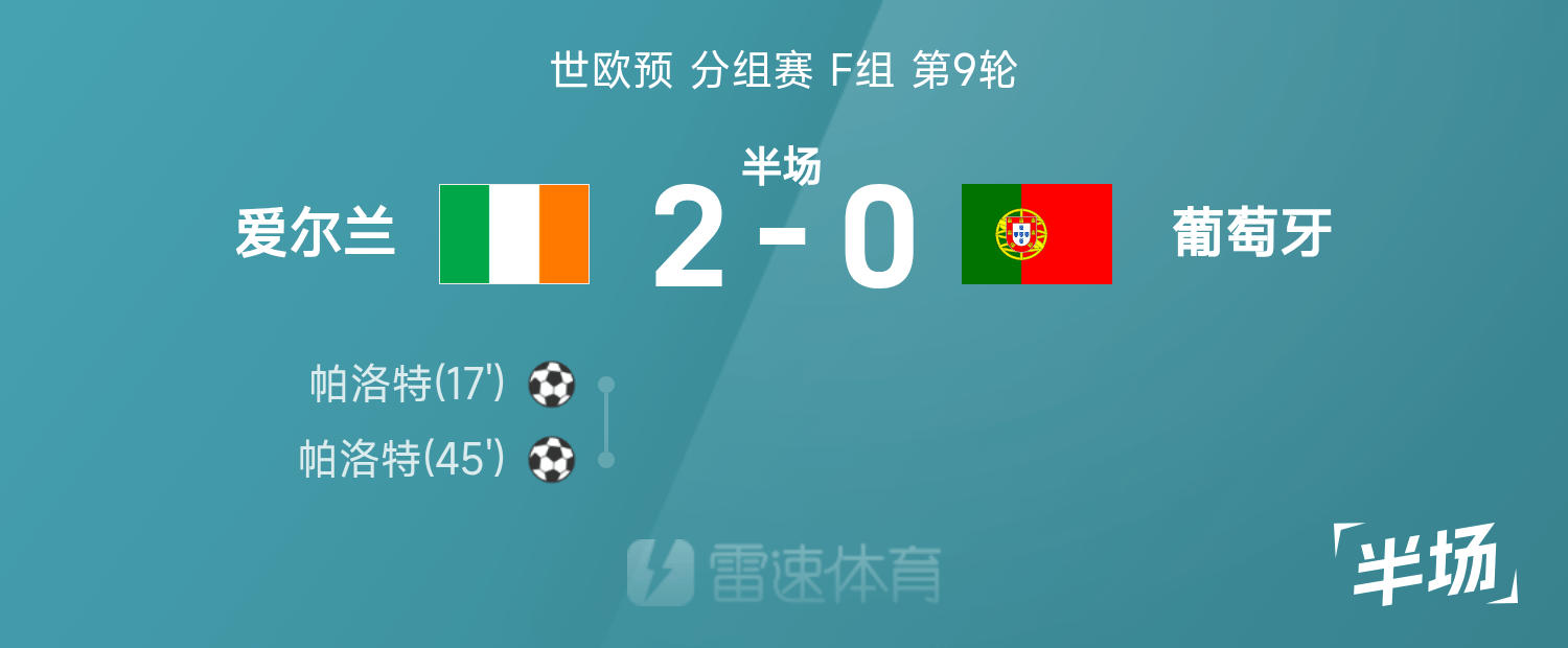 雷速體育11月14日訊 26賽季世歐預(yù)分組賽F組第9輪,愛爾蘭迎戰(zhàn)葡萄牙。半場戰(zhàn)罷,雙方比分暫為愛爾蘭2-0葡萄牙,帕洛特上演梅開二度。