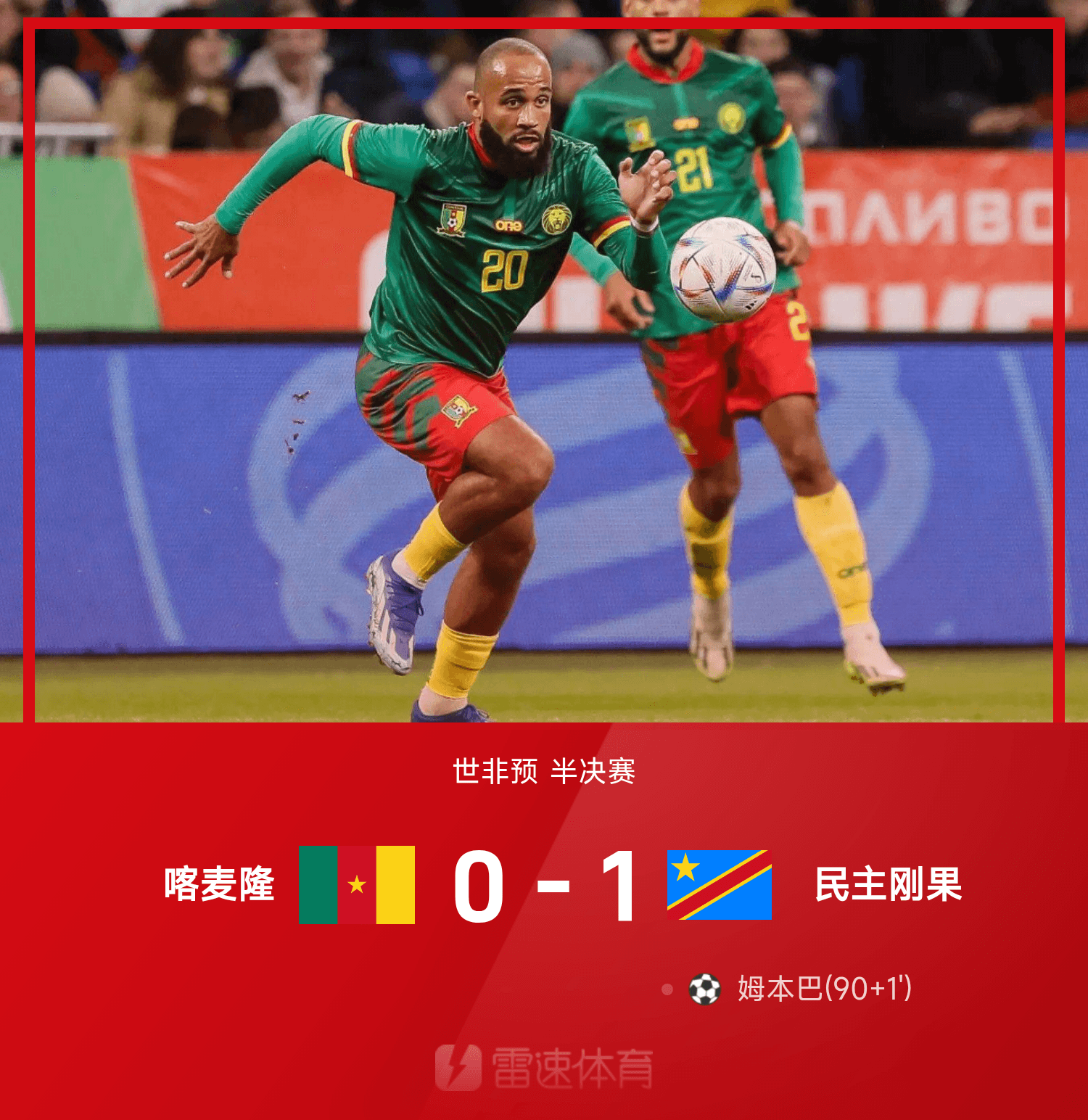 雷速體育11月14日訊 26賽季世非預(yù)半決賽,民主剛果1-0戰(zhàn)勝喀麥隆,姆本巴第90+1分鐘上演絕殺。喀麥隆世非預(yù)半決賽出局,無(wú)緣美加墨世界杯。