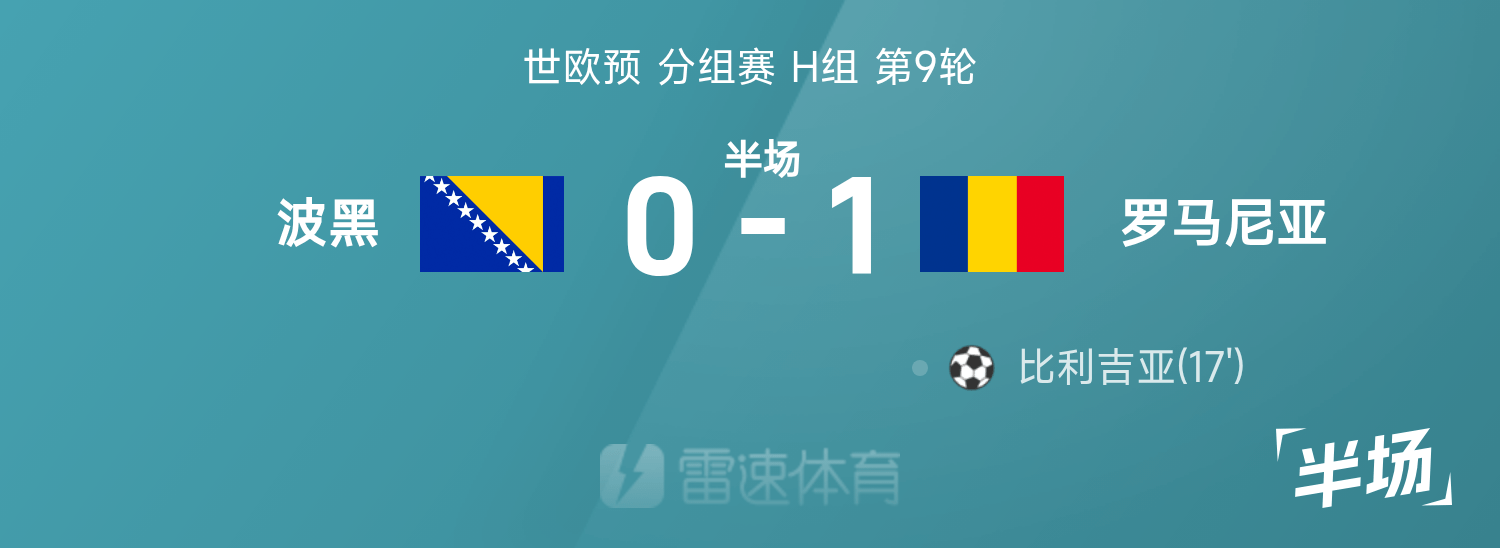 雷速體育11月16日訊 26賽季世歐預(yù)分組賽H組第9輪,波黑迎戰(zhàn)羅馬尼亞。半場戰(zhàn)罷,雙方比分暫為波黑0-1羅馬尼亞,比利吉亞破門建功。