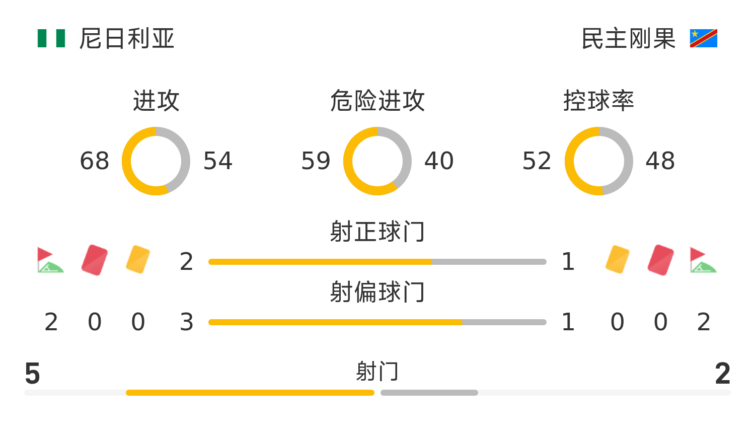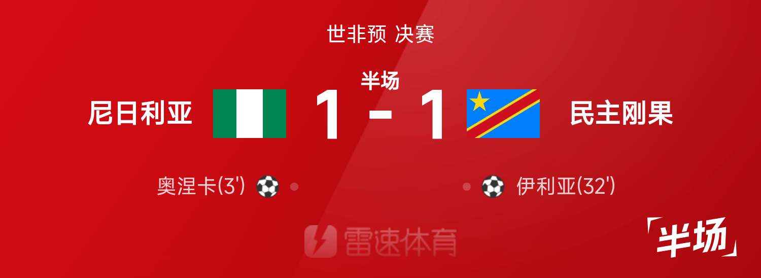 雷速體育11月17日訊 26賽季世非預(yù)決賽,尼日利亞迎戰(zhàn)民主剛果。半場(chǎng)戰(zhàn)罷,雙方比分暫為尼日利亞1-1民主剛果,奧涅卡、伊利亞破門建功。