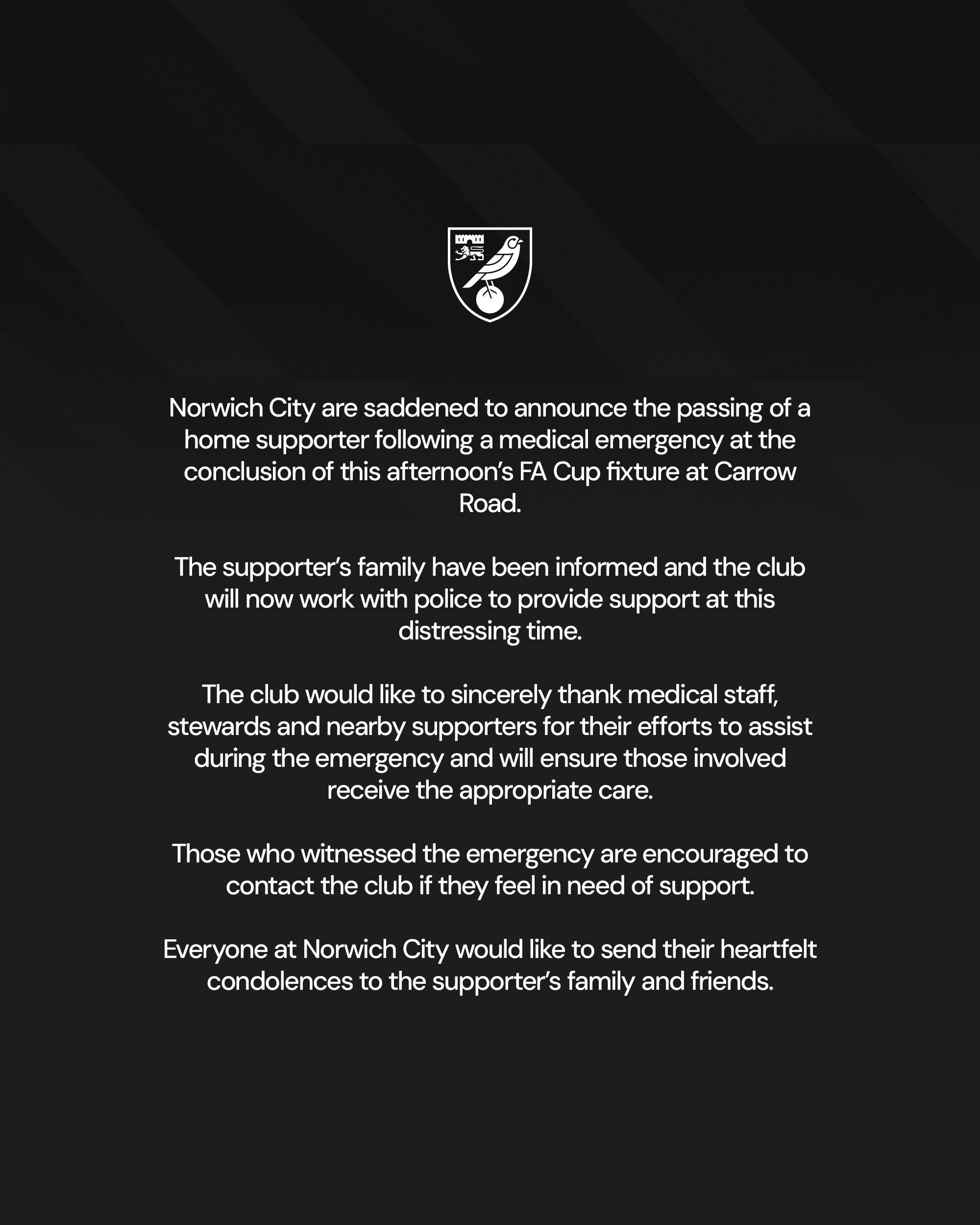 諾維奇足球俱樂部沉痛公告:在今日下午卡羅路球場進行的足總杯賽事結束后,一位主場球迷突發(fā)疾病,經(jīng)搶救無效不幸離世。