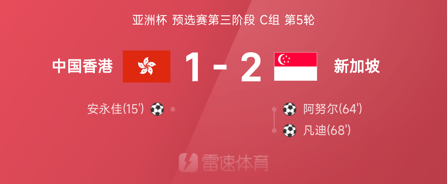 雷速體育11月18日訊 27賽季亞洲杯預選賽第三階段C組第5輪,新加坡2-1戰(zhàn)勝中國香港。全場比賽,凡迪發(fā)揮出色貢獻1射1傳,阿努爾破門建功,安永佳破門難救主。
