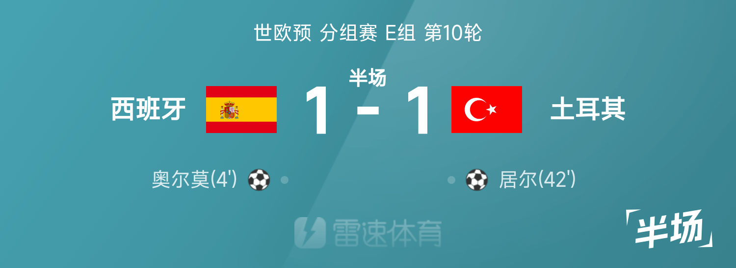 雷速體育11月19日訊 26賽季世歐預(yù)分組賽E組第10輪,西班牙迎戰(zhàn)土耳其。半場(chǎng)戰(zhàn)罷,雙方比分暫為西班牙1-1土耳其,奧爾莫、居爾破門建功。