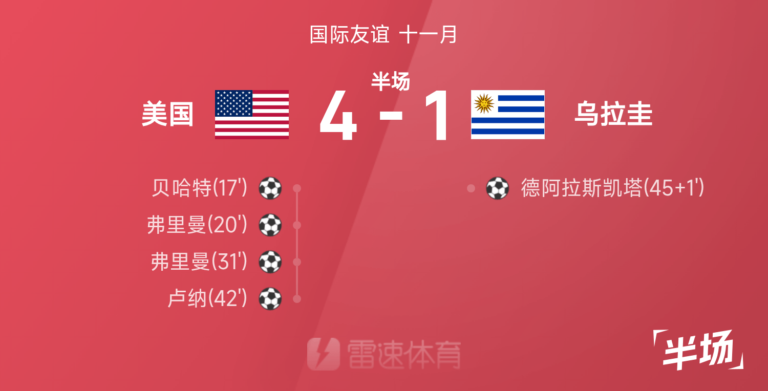 雷速體育11月19日訊 25賽季國(guó)際友誼十一月,美國(guó)迎戰(zhàn)烏拉圭。上半場(chǎng)美國(guó)多點(diǎn)開(kāi)花,貝哈特傳射建功,弗里曼雙響,盧納也打入一球,烏拉圭在半場(chǎng)結(jié)束時(shí)壓哨破門(mén)扳回一城。半場(chǎng)戰(zhàn)罷,美國(guó)暫4-1烏拉圭。