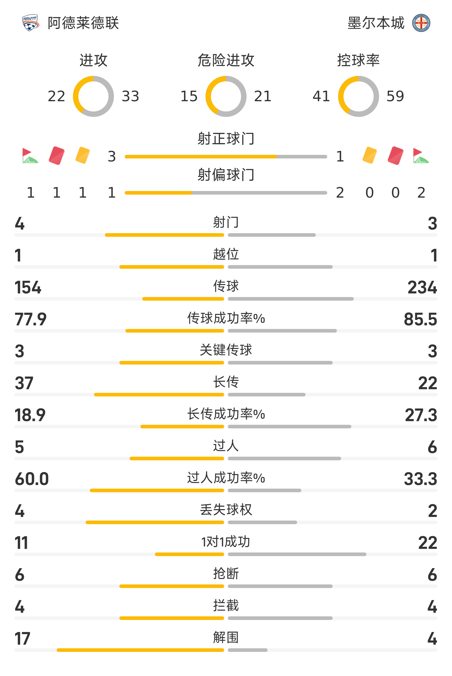 雷速體育11月21日訊 25/26賽季澳超聯(lián)賽第5輪,阿德萊德聯(lián)迎戰(zhàn)墨爾本城。半場(chǎng)戰(zhàn)罷,雙方比分暫為阿德萊德聯(lián)2-1墨爾本城,約萬(wàn)諾維奇發(fā)揮出色貢獻(xiàn)1射1傳,皮埃利亞斯染紅。