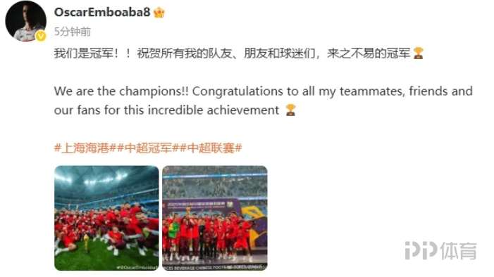 海港功勛外援奧斯卡在社媒中寫道:“我們是冠軍??!祝賀所有我的隊友、朋友和球迷們,來之不易的冠軍 ”