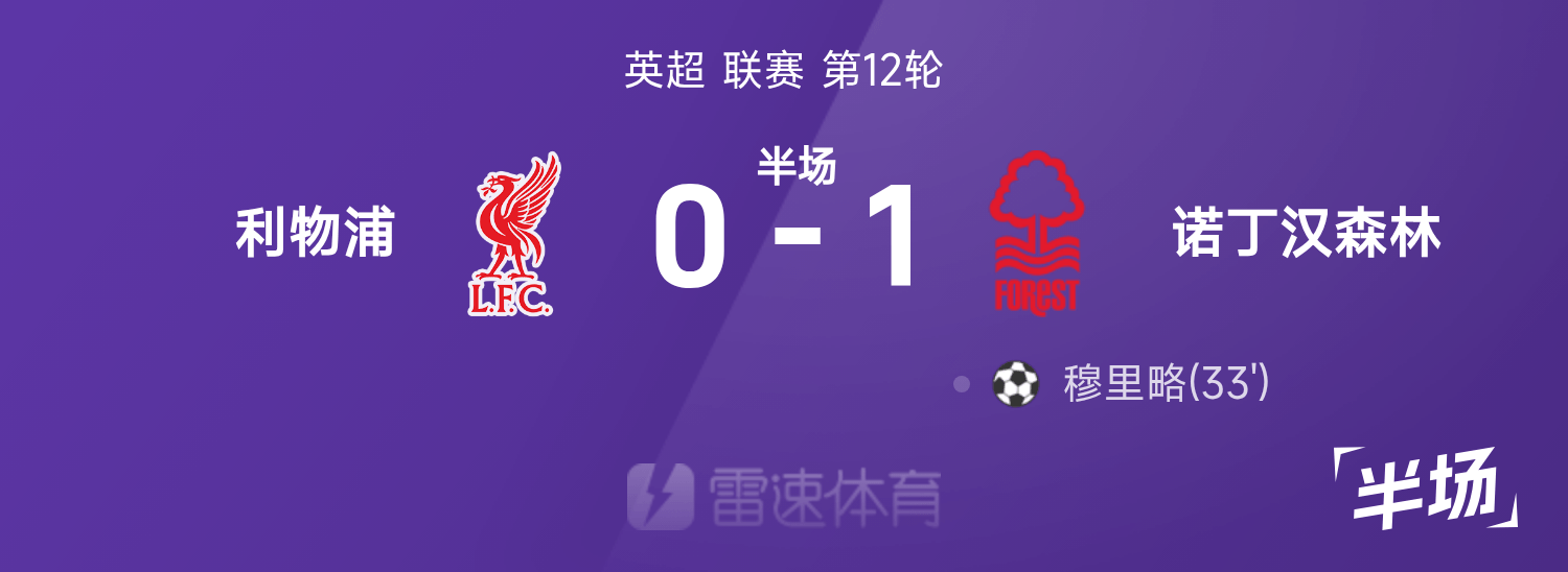 雷速體育11月22日訊 25/26賽季英超聯(lián)賽第12輪,利物浦迎戰(zhàn)諾丁漢森林。半場戰(zhàn)罷,雙方比分暫為利物浦0-1諾丁漢森林,穆里略破門建功,熱蘇斯進球被吹。