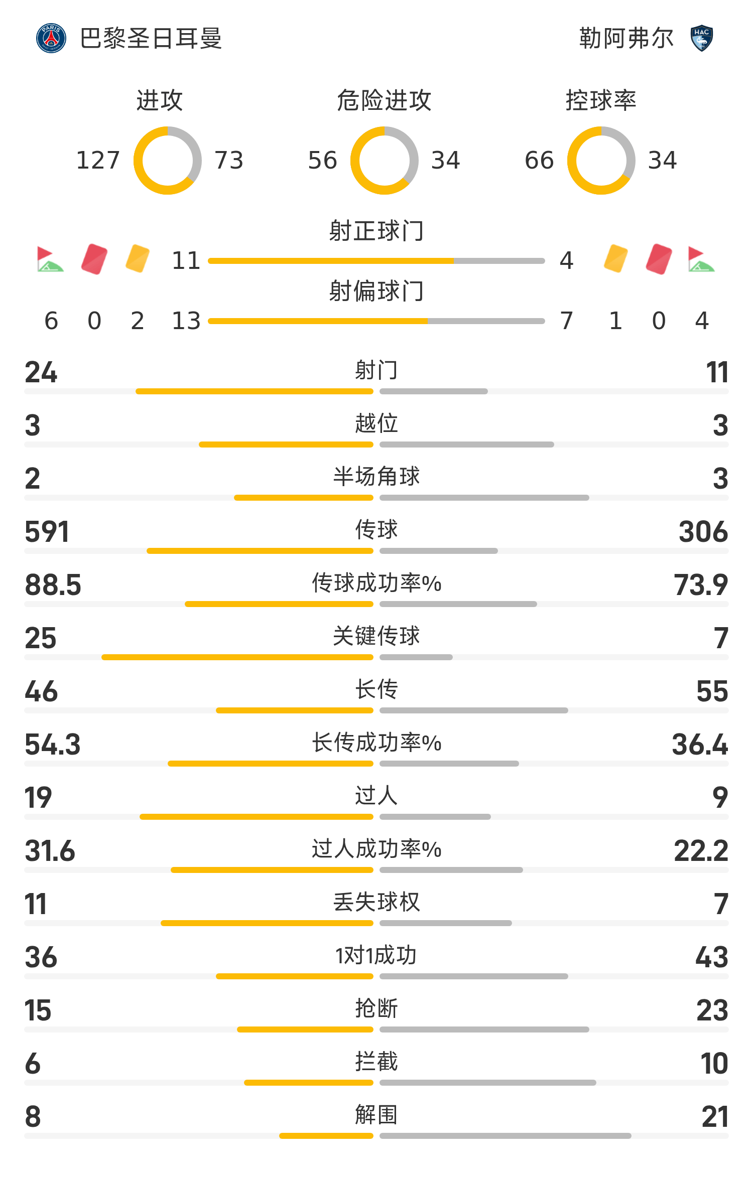 雷速體育11月23日訊 25/26賽季法甲聯(lián)賽第13輪,巴黎圣日耳曼3-0戰(zhàn)勝勒阿弗爾。上半場李剛?cè)势崎T,拉莫斯屢失良機,下半場姆巴耶中框,內(nèi)維斯建功,巴爾科拉鎖定勝局。