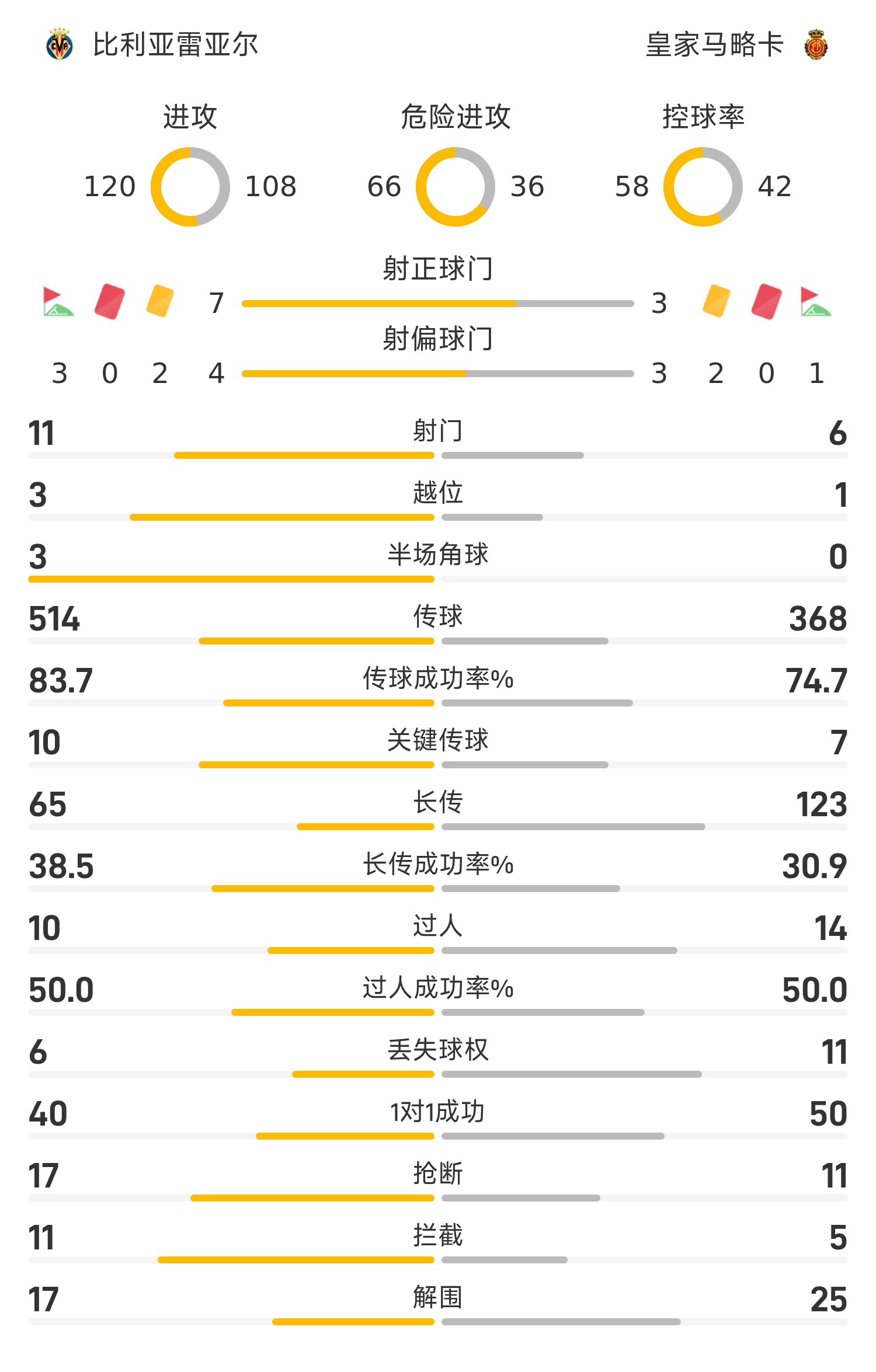 雷速體育11月23日訊 25/26賽季西甲聯(lián)賽第13輪,比利亞雷亞爾2-1戰(zhàn)勝皇家馬略卡,上半場莫雷諾破門,科斯塔扳平,下半場伯格斯特倫神撲,奧盧瓦塞伊建功。