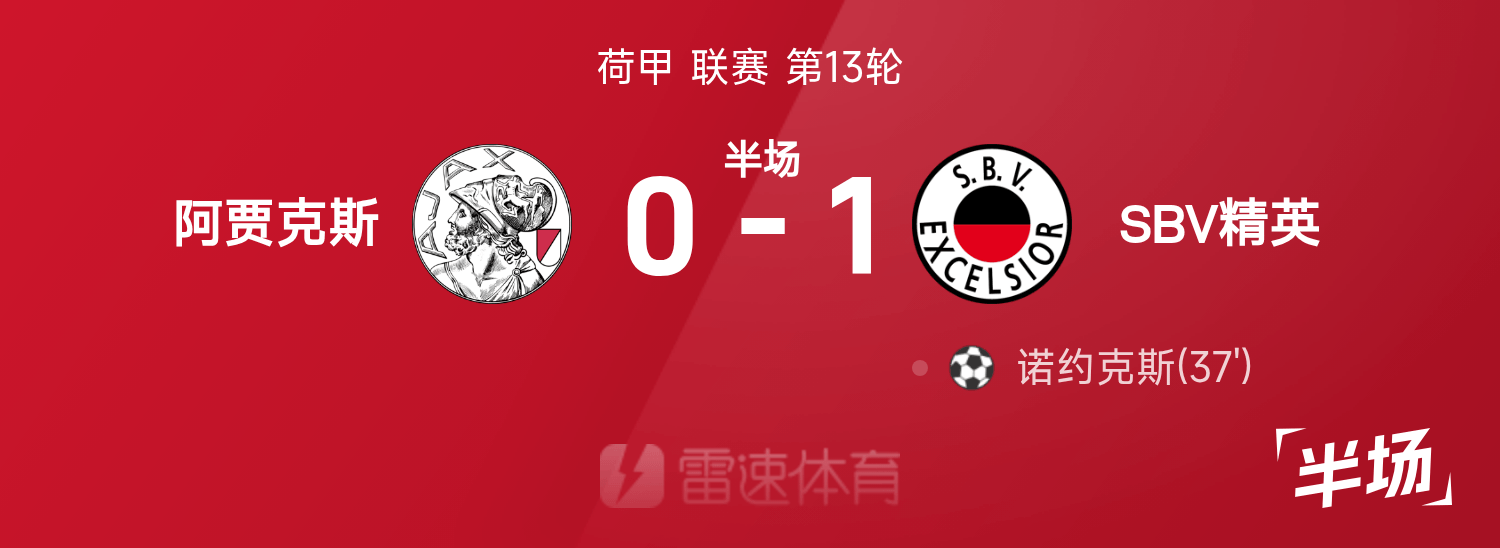 雷速體育11月23日訊 25/26賽季荷甲聯(lián)賽第13輪,阿賈克斯迎戰(zhàn)SBV精英。半場戰(zhàn)罷,雙方比分暫為阿賈克斯0-1SBV精英,諾約克斯破門建功。