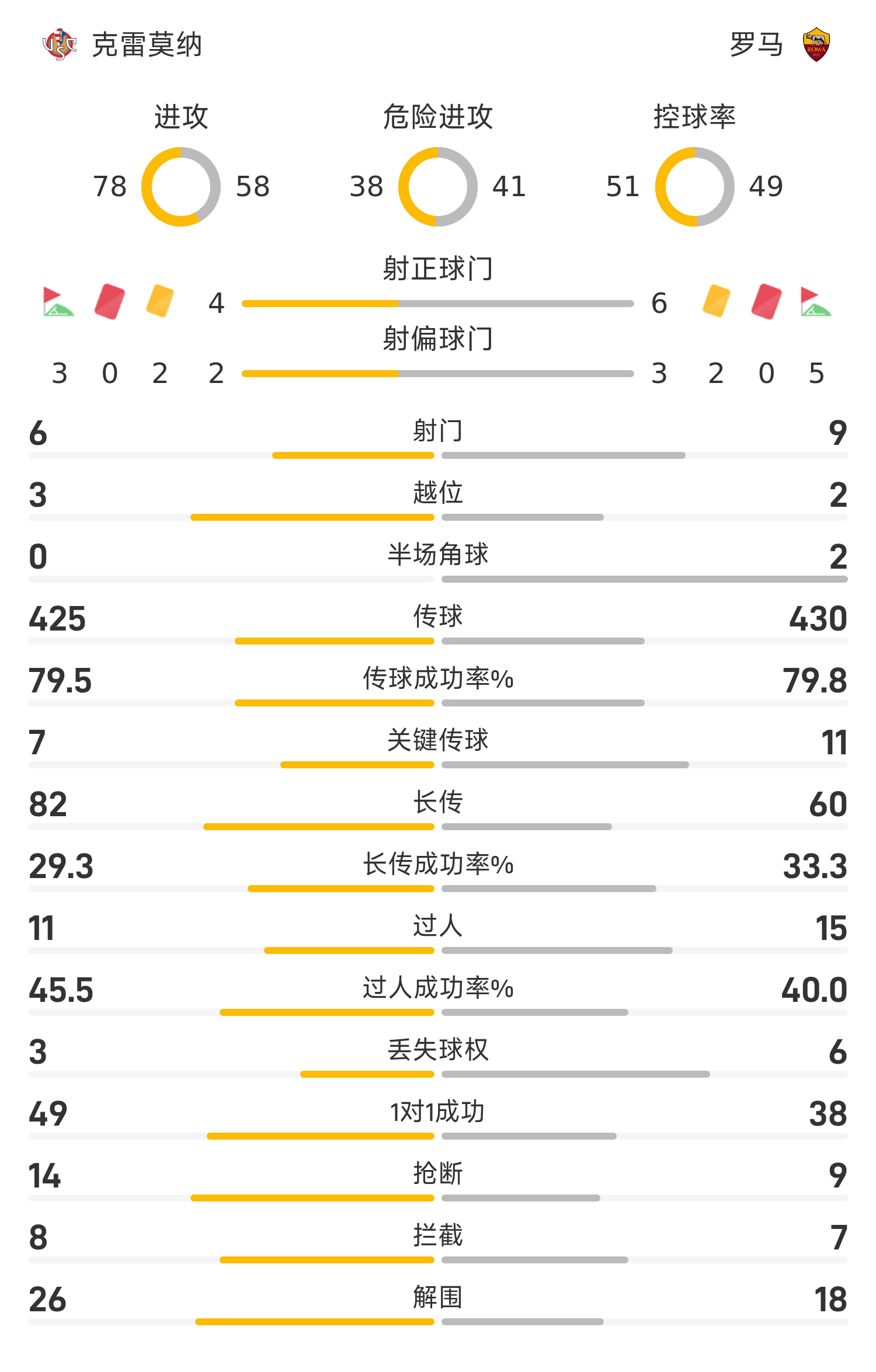 雷速體育11月23日訊 25/26賽季意甲聯(lián)賽第12輪,羅馬3-1戰(zhàn)勝克雷莫納。上半場比賽,蘇萊遠(yuǎn)射破門,下半場加斯佩里尼染紅后弗格森、韋斯利迅速破門建立優(yōu)勢,最后時(shí)刻福利諾頭球破門扳回一城。