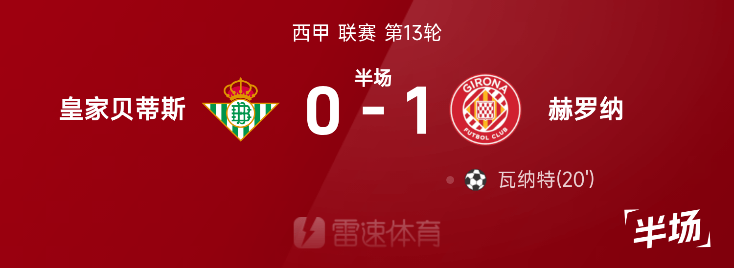 雷速體育11月24日訊 25/26賽季西甲聯(lián)賽第13輪,皇家貝蒂斯迎戰(zhàn)赫羅納。半場戰(zhàn)罷,雙方比分暫為皇家貝蒂斯0-1赫羅納,瓦納特破門建功。