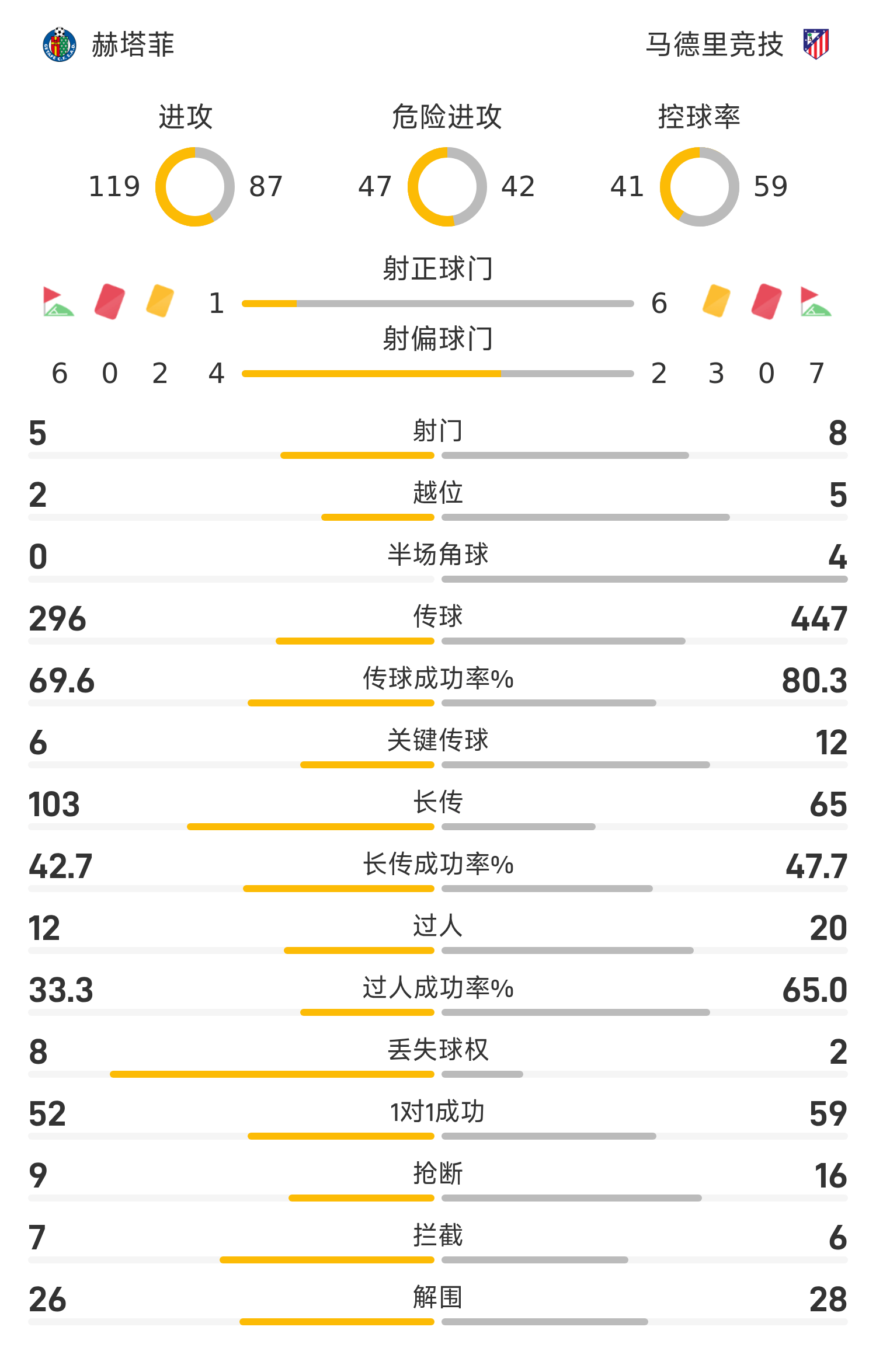 雷速體育11月24日訊 25/26賽季西甲聯(lián)賽第13輪,馬德里競(jìng)技1-0戰(zhàn)勝赫塔菲。上半場(chǎng)索里亞神撲救主,雙方均無(wú)建樹(shù)。下半場(chǎng)索里亞發(fā)揮依舊神勇,但比賽結(jié)束前,拉斯帕多里傳中造杜阿爾特烏龍,補(bǔ)時(shí)階段,阿蘭巴里倒鉤射門(mén)擊中橫梁。最終,馬德里競(jìng)技客場(chǎng)1-0小勝赫塔菲。