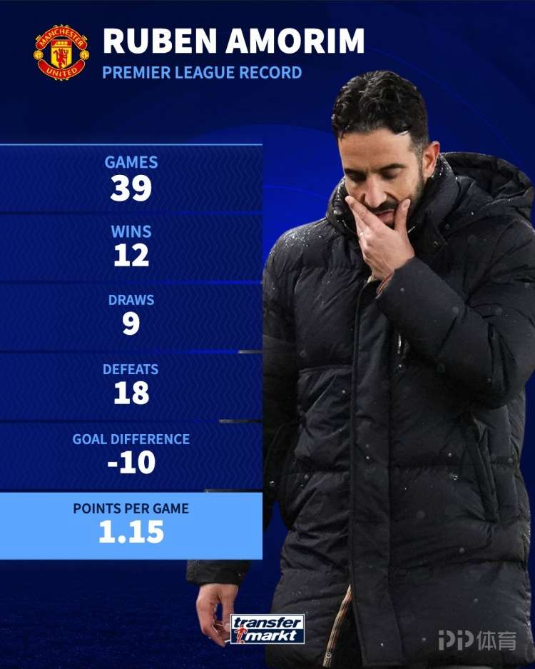 德國轉(zhuǎn)會(huì)市場(chǎng)統(tǒng)計(jì)了阿莫林執(zhí)教曼聯(lián)的英超數(shù)據(jù),他帶領(lǐng)曼聯(lián)參加39場(chǎng)英超比賽,戰(zhàn)績(jī)12勝9平18負(fù),凈勝球-10,場(chǎng)均拿到1.15分。