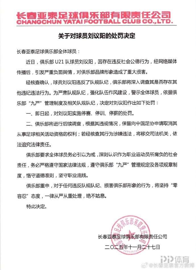 長(zhǎng)春亞泰官方發(fā)文公布對(duì)U21球員劉議陽(yáng)的處罰決定。先前,劉議陽(yáng)被爆出出軌、裸聊等違反社會(huì)公德行為。