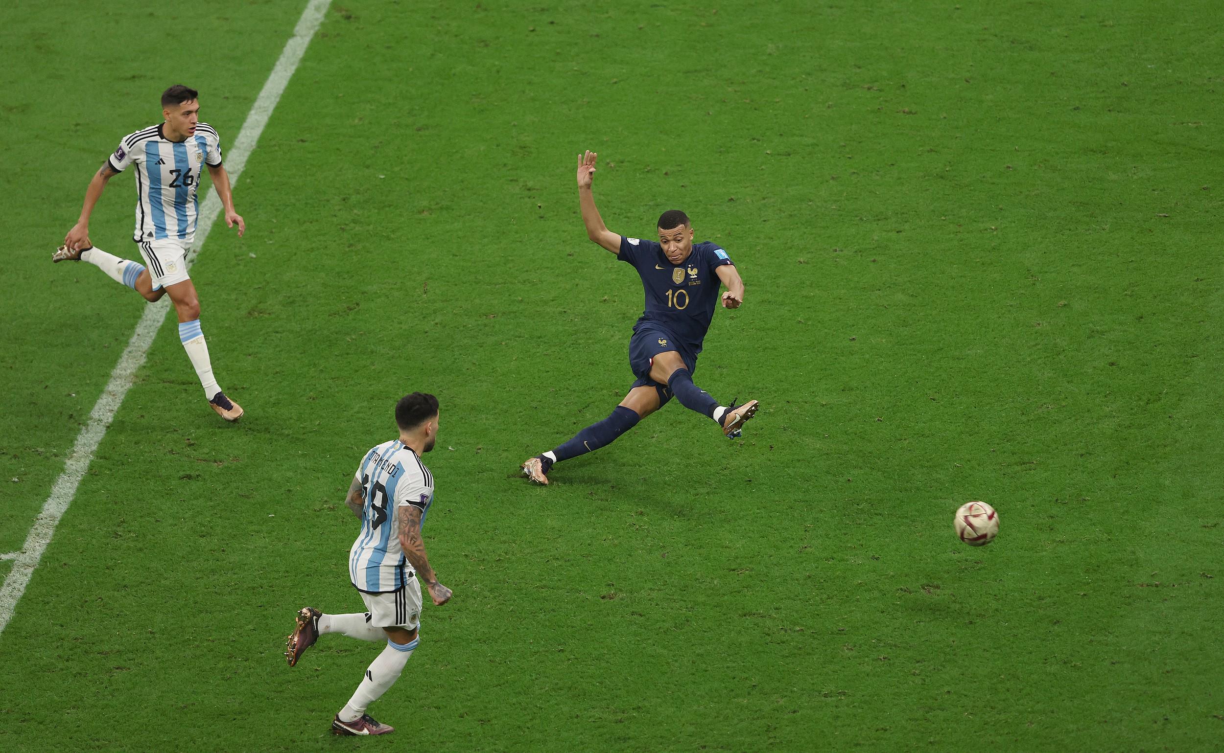 2022年12月18日,世界杯決賽,法國半場0-2落后阿根廷。第80分鐘,姆巴佩點(diǎn)球扳回一城。97秒后,姆巴佩與小圖拉姆打出配合,隨后高難度凌空臥射破門,為法國隊(duì)扳平了比分!