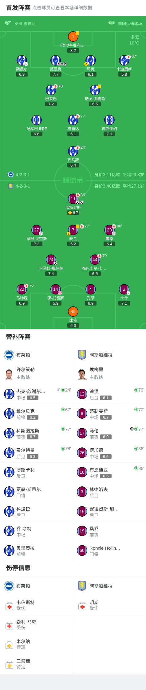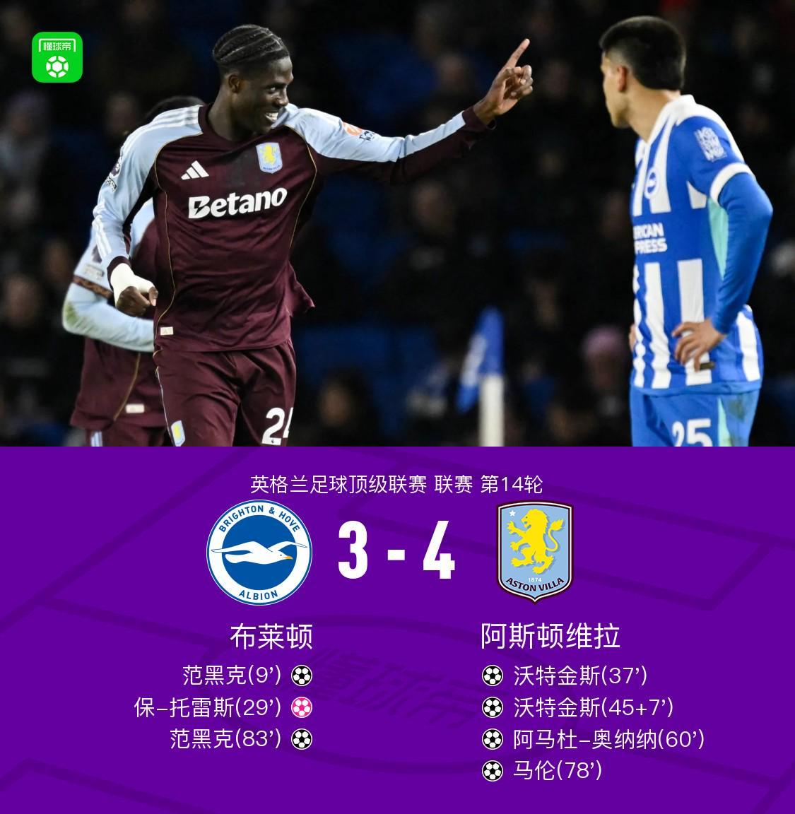 北京時(shí)間12月4日,英格蘭足球超級(jí)聯(lián)賽第14輪展開較量,布萊頓坐鎮(zhèn)主場(chǎng)迎戰(zhàn)阿斯頓維拉。上半場(chǎng),范黑克頭球被擋后補(bǔ)射破門,齊馬斯扭傷腿部離場(chǎng),欣謝爾伍德打門造成保-托雷斯自擺烏龍,馬特森助攻沃特金斯破門,羅杰斯助攻沃特金斯雙響扳平;下半場(chǎng),卡什角球助攻奧納納破門完成逆轉(zhuǎn),蓋桑頭球被撲后馬倫補(bǔ)射入網(wǎng),欣謝爾伍德助攻范黑克同樣梅開二度。最終全場(chǎng)戰(zhàn)罷,布萊頓3比4不敵阿斯頓維拉。