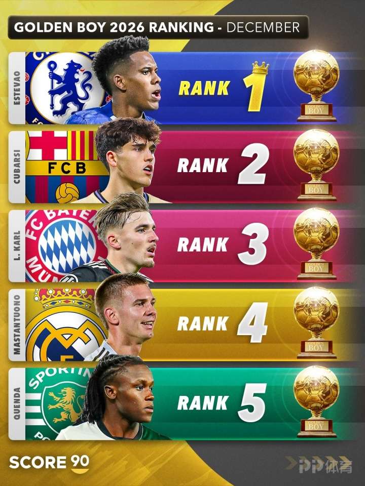 Score90列出了2026年金童排名預(yù)測(cè),埃斯特旺居首,庫巴西、卡爾分列二三。