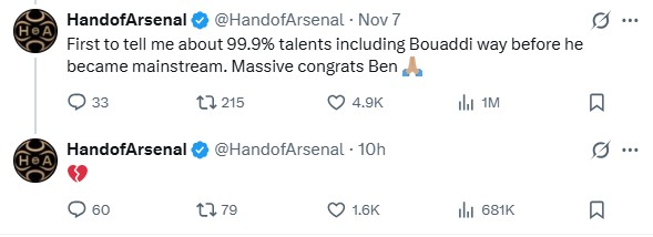 下圖中是原帖,報(bào)道布阿迪接近加盟巴黎的記者Rodra,是ESPN的西班牙語(yǔ)記者,他本身的可信度可能沒那么高,但聯(lián)合handofarsenal的反應(yīng),可能情況比較微妙,未來也非常值得關(guān)注。