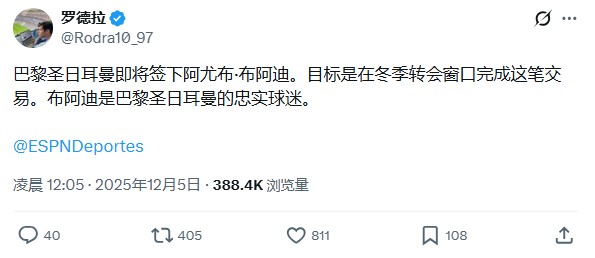 在社交媒體上,Rodra表示,布阿迪是巴黎圣日耳曼的球迷,他加盟巴黎的轉(zhuǎn)會(huì)可能將在冬季完成,這一消息吸引了400條以上的轉(zhuǎn)發(fā)和熱議。