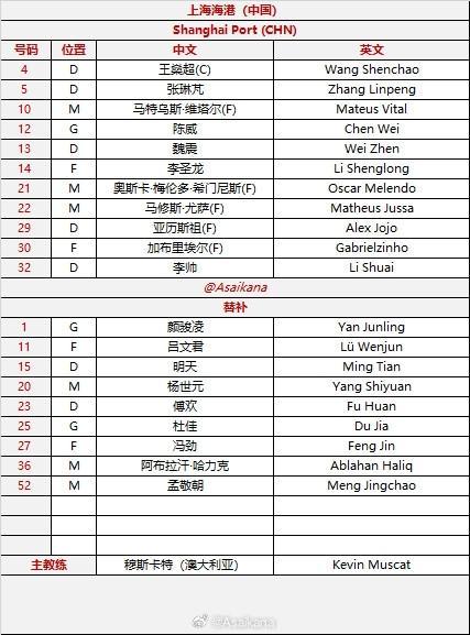 上海海港首發(fā):12-陳威、4-王燊超、5-張琳芃、10-維塔爾、13-魏震、14-李圣龍、21-梅倫多、22-茹薩、29-亞歷斯祖、30-加布里埃爾、32-李帥