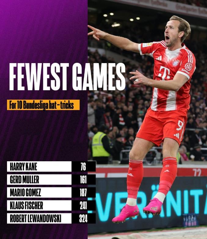根據(jù)統(tǒng)計(jì),凱恩在他的第76場(chǎng)德甲比賽中打入了在聯(lián)賽中的第10個(gè)帽子戲法,成為德甲完成10次帽子戲法所用場(chǎng)次最少的球員。