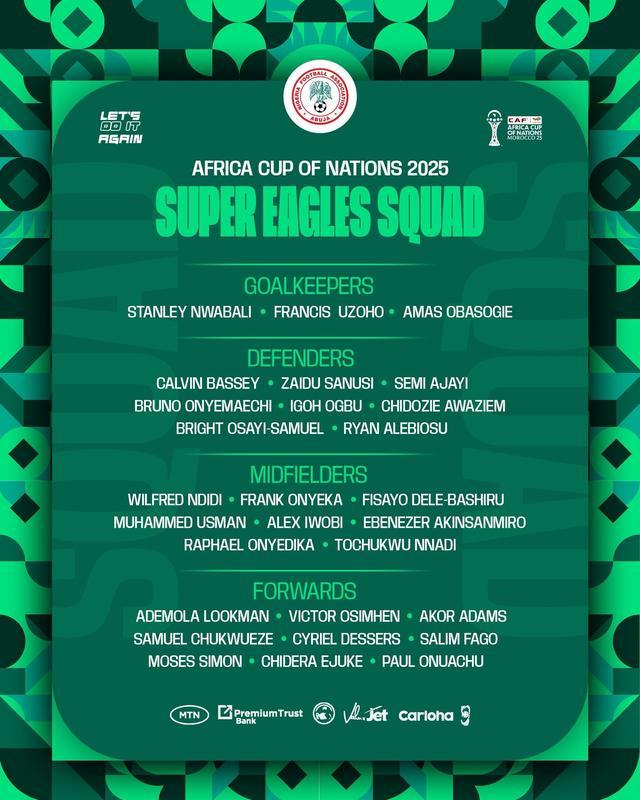 尼日利亞國家隊(duì)2025年非洲杯大名單: