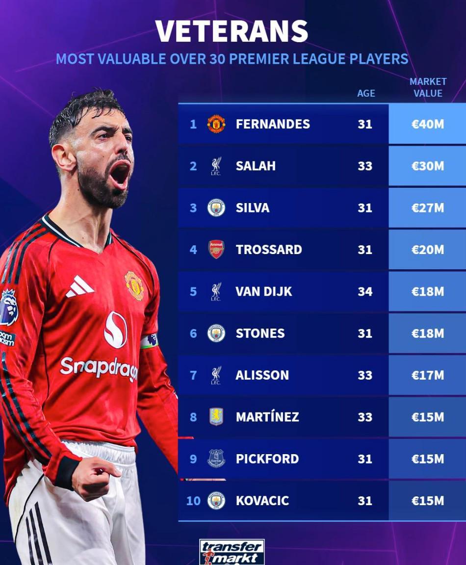 英超30歲以上球員身價榜:B費4000萬歐第1,薩拉赫3000萬第2