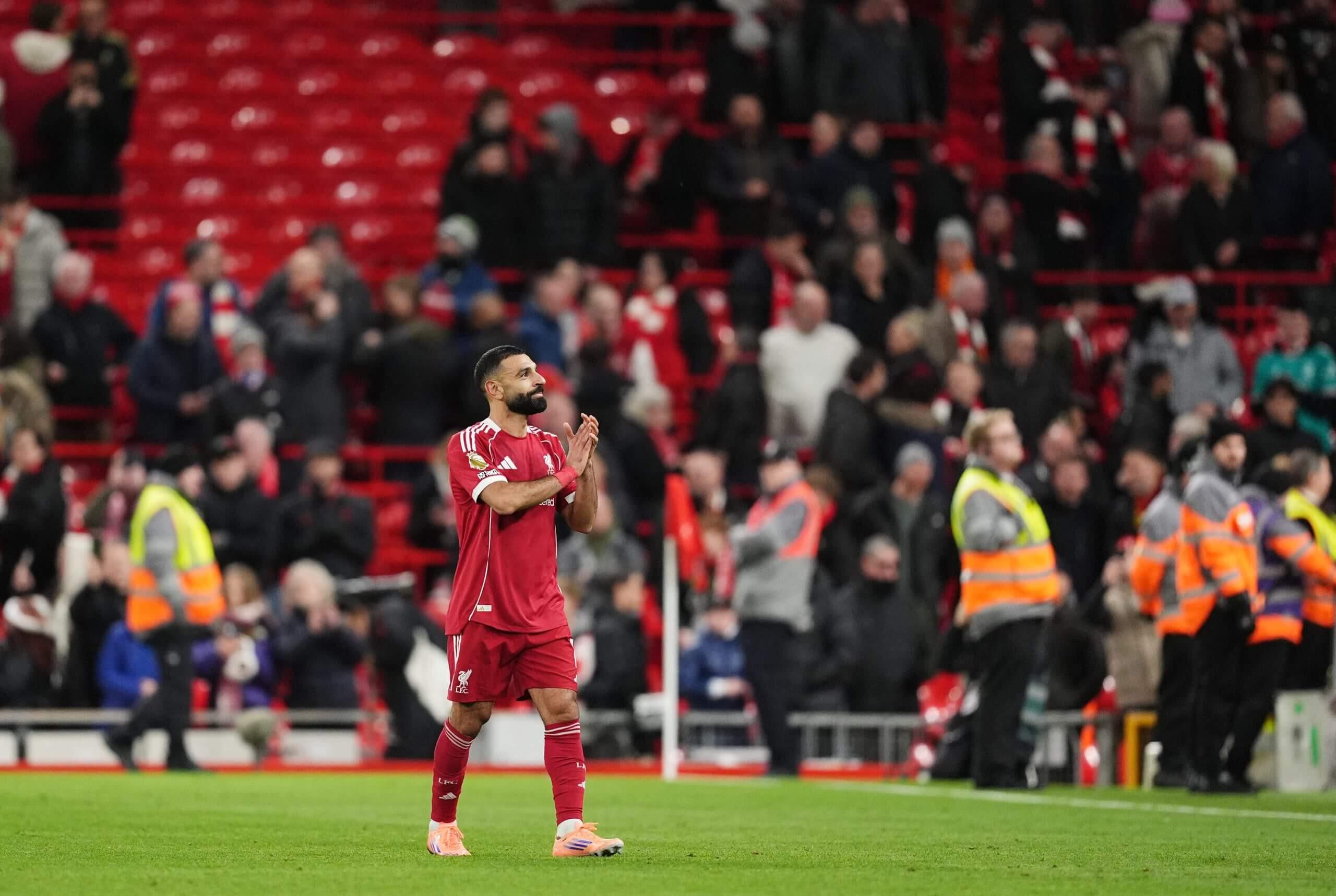 終場哨響后,這位埃及攻擊手向安菲爾德球場的四面看臺鼓掌致意——他短暫停步,輕拍球衣上的俱樂部徽章,隨后在社媒上發(fā)布了這一刻的視頻——然后消失在球員通道中。