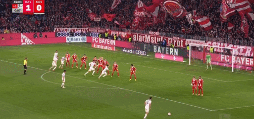 第45+2分鐘,伯溫開出任意球,波圖爾斯基頭球破門,美因茨1-1拜仁