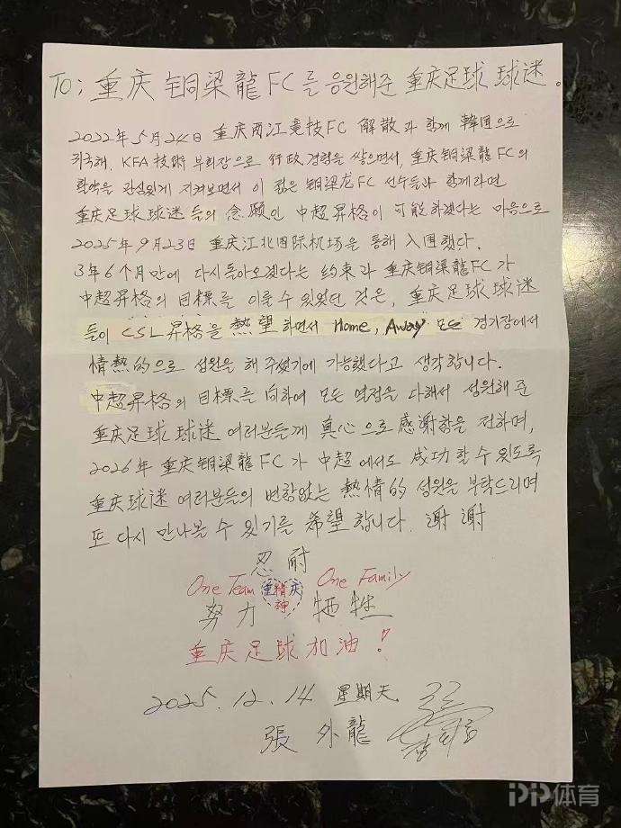 在張外龍告別重慶銅梁龍后,《足球報(bào)》曬出了他親手寫的告別信。