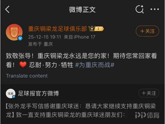 在《足球》報曬出張外龍手寫信后,重慶銅梁龍官方轉(zhuǎn)發(fā)并評論。致敬張導(dǎo)!重慶銅梁龍永遠是您的家!期待您?;丶铱纯?!忍耐·努力·犧牲 #為重慶而戰(zhàn)