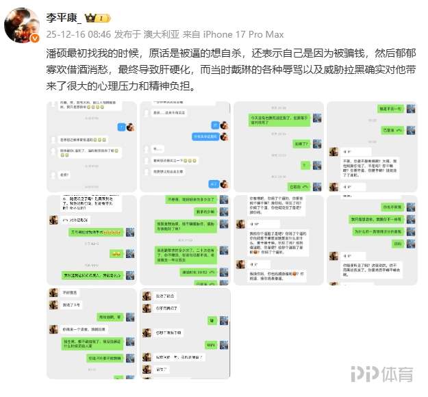 媒體人李平康曬出了已故球迷潘碩最初找他幫忙的聊天記錄表示:潘碩最初找我的時(shí)候,原話是被逼的想自殺,還表示自己是因?yàn)楸或_錢,然后郁郁寡歡借酒消愁,最終導(dǎo)致肝硬化,而當(dāng)時(shí)戴琳的各種辱罵以及威脅拉黑確實(shí)對他帶來了很大的心理壓力和精神負(fù)擔(dān)。 ???