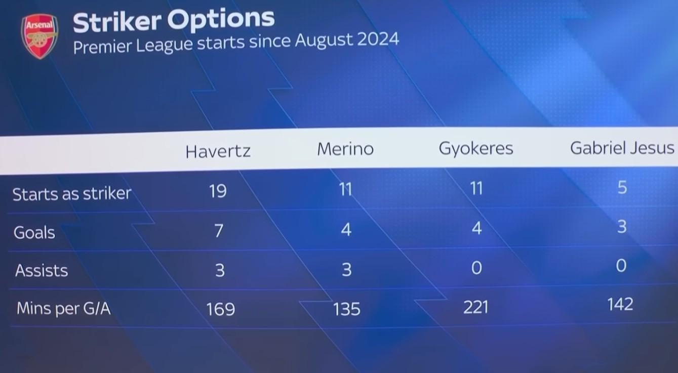 主持人:阿爾特塔現(xiàn)在的確擁有更多選擇,可以說是四種鋒線方案:熱蘇斯已經(jīng)回歸,哈弗茨也預(yù)計在2026年初、也就是幾周后復(fù)出。這是他們自上賽季以來在英超的數(shù)據(jù)貢獻。底部顯示的是這四名球員“每分鐘參與進球(進球+助攻)”的效率??梢钥闯?,梅里諾目前可能是效率最高的,而哲凱賴什暫時最低。在這四人中,你認(rèn)為阿爾特塔最終會依靠誰幫助球隊贏得本賽季冠軍?