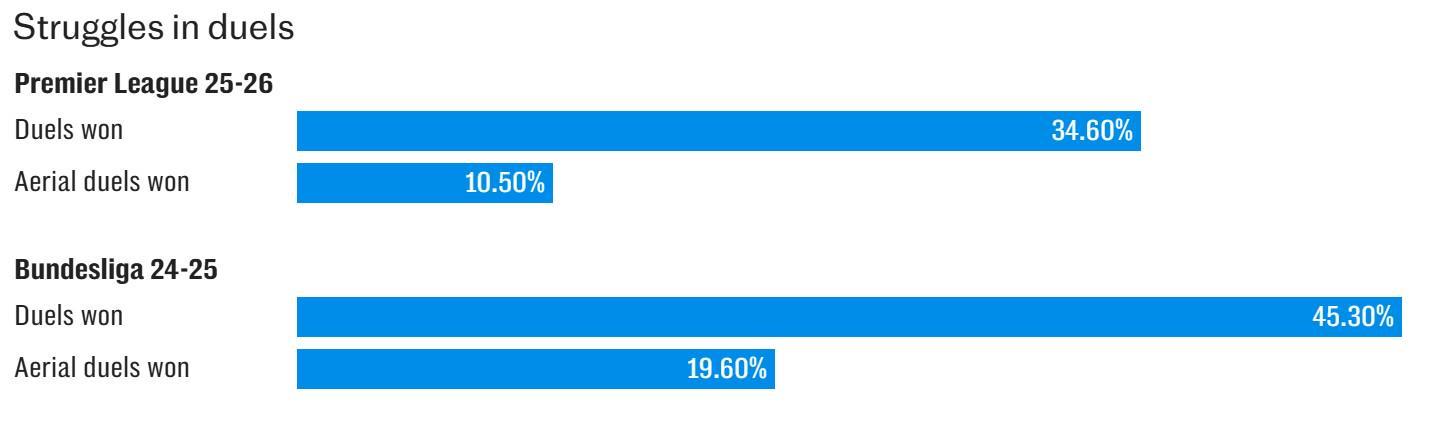本賽季在英超,他的對(duì)抗成功率僅為35%(空中對(duì)抗成功率為11%),而相比之下,上賽季在德甲的成功率為45%(空中對(duì)抗為20%)。換句話說(shuō),維爾茨尚未適應(yīng)英格蘭足球在身體對(duì)抗強(qiáng)度上的提升。